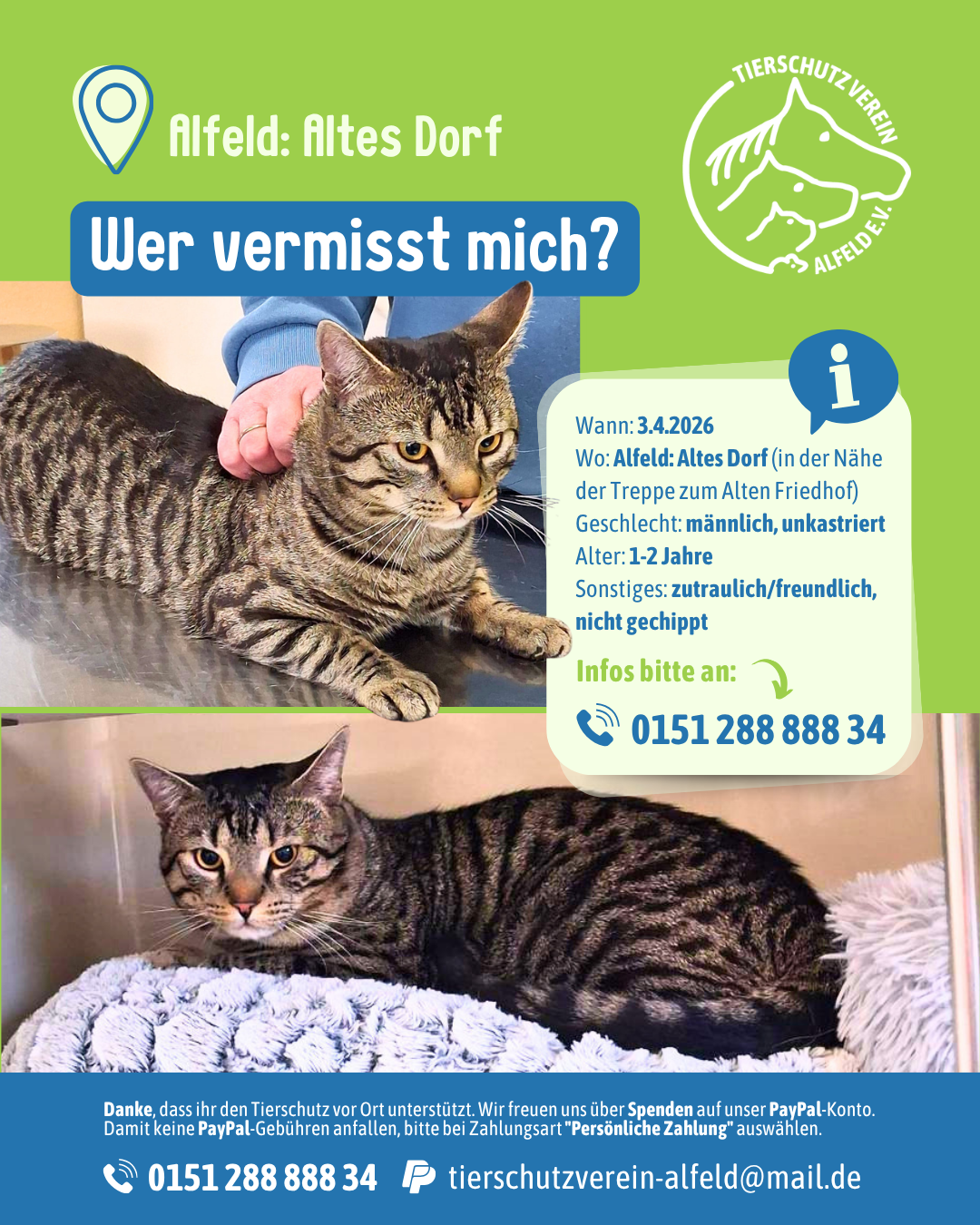 Dieser junge Kater ist uns in Alfeld (Altes Dorf, gegenüber der Treppe zum alten Friedhof) zugelaufen – und jetzt hoffen wir, seine Menschen zu finden. 💔