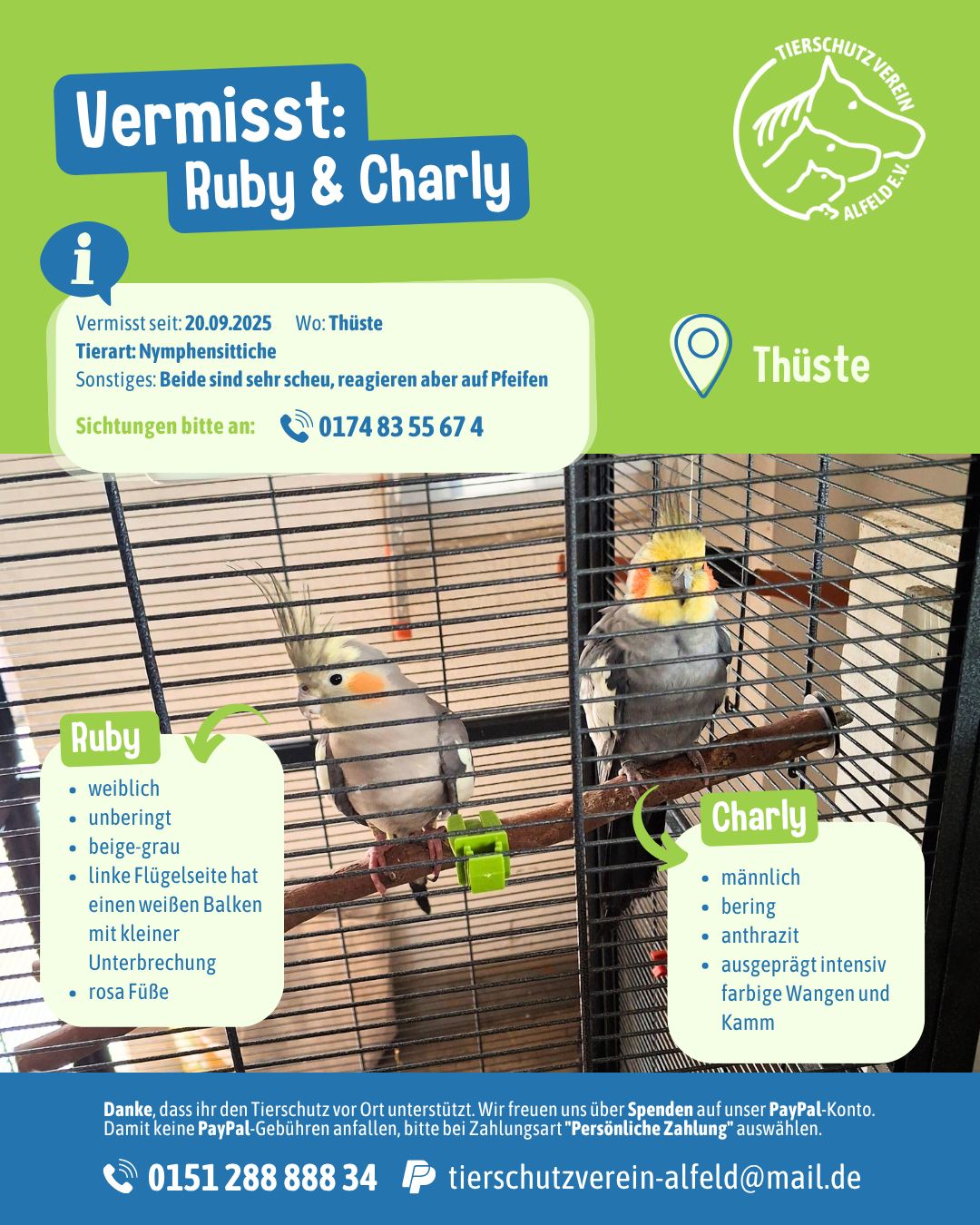 Die beiden Nymphensittiche Ruby und Charly werden schmerzlichst vermisst. Bereits [...]