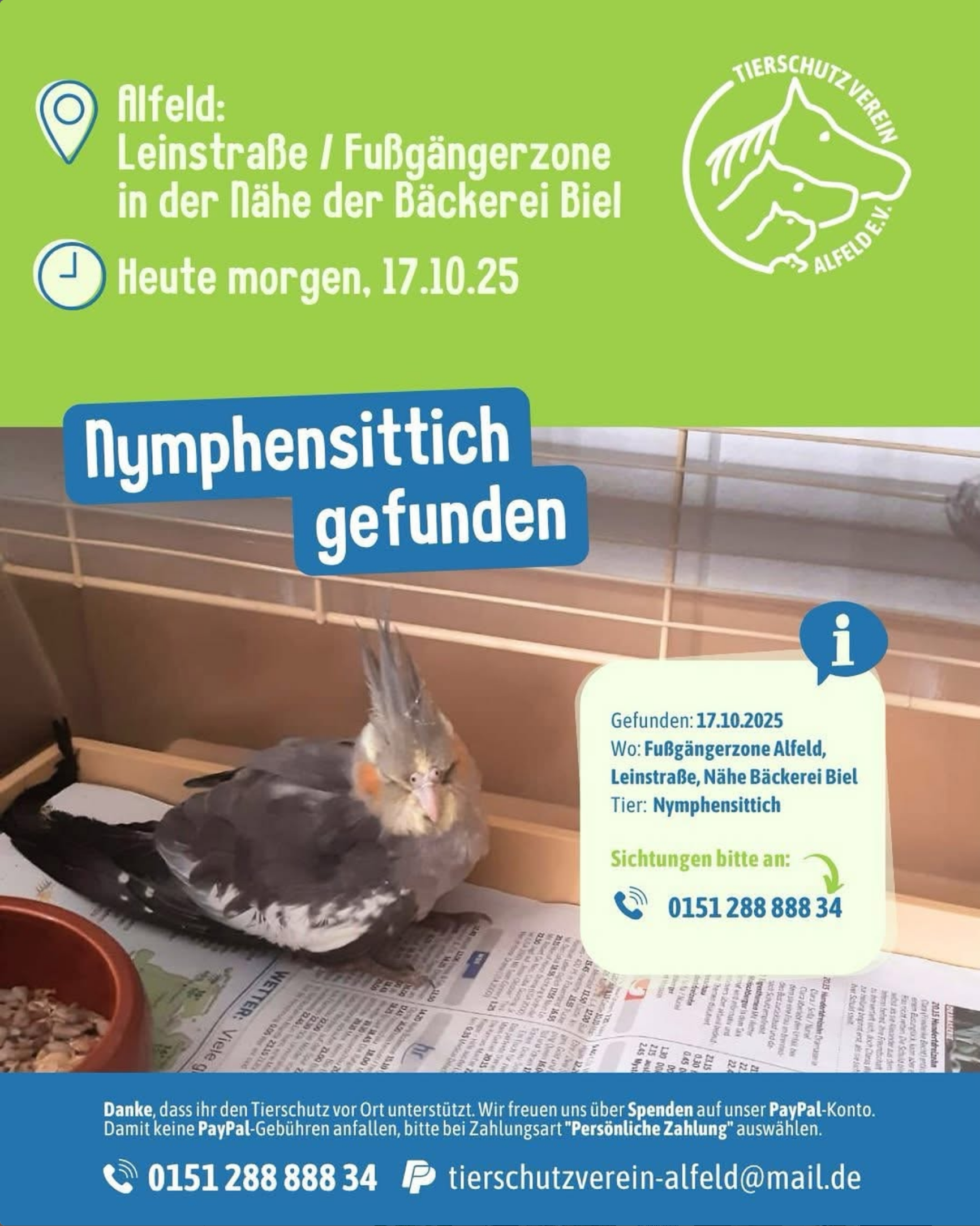 ❗Mymphensittich gefunden 🐦 Wer vermisst seinen Nymphensittich oder weiß, [...]