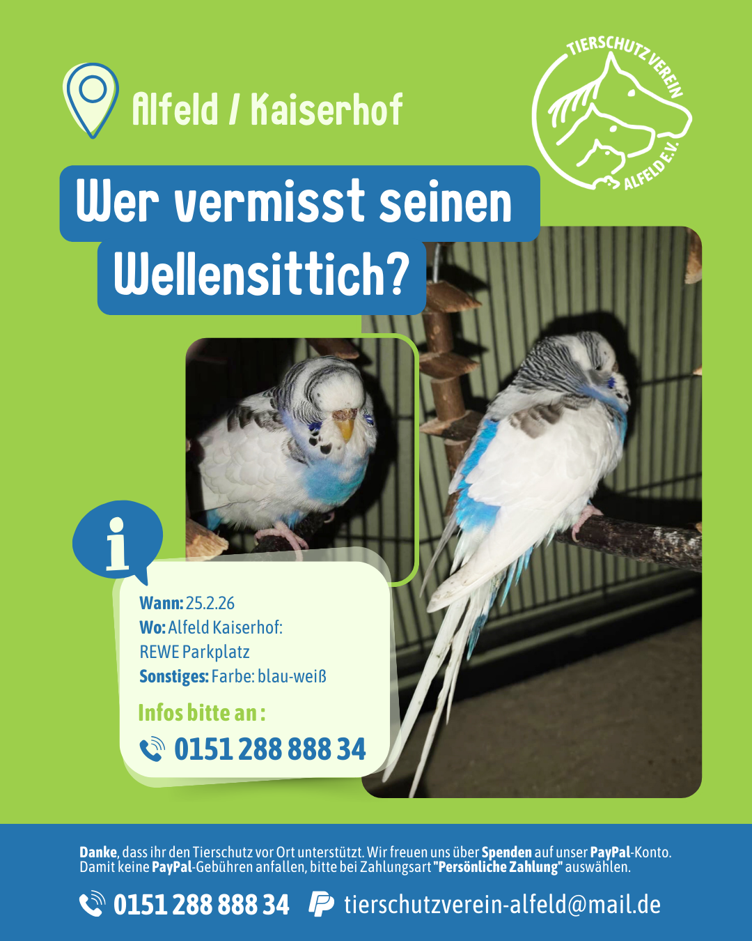 🐾 Fundtier am Rewe-Parkplatz / Kaiserhof: Wellensittich 🐾 Heute [...]