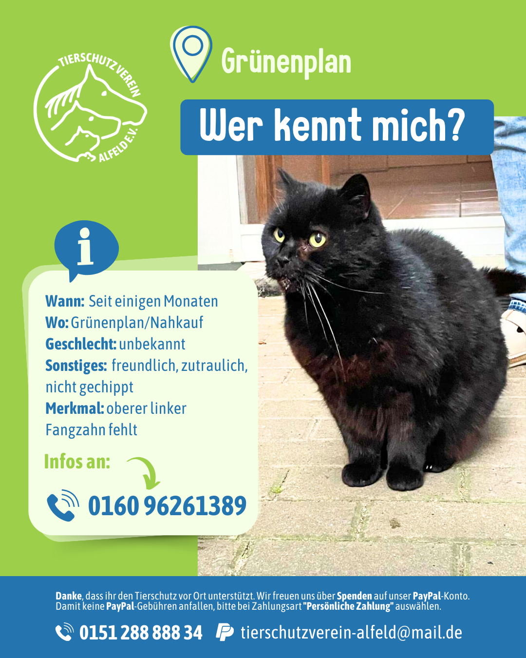 Seit einiger Zeit hält sich diese Katze rund um den Nahkauf in der Oberen Hilsstraße in Grünenplan auf. Sie ist nicht gechippt, sehr zutraulich und sucht aktiv die Nähe von Menschen. Das Geschlecht konnte bisher leider noch nicht festgestellt werden. Auffällig ist: Ihr fehlt der obere linke Fangzahn.