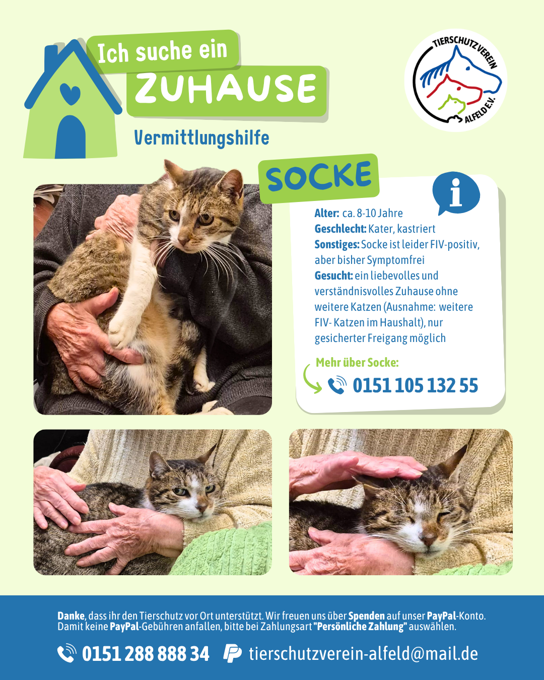 Socke ist etwa 8–10 Jahre alt, kastriert, gechippt und ein ganz lieber, ruhiger Gefährte.