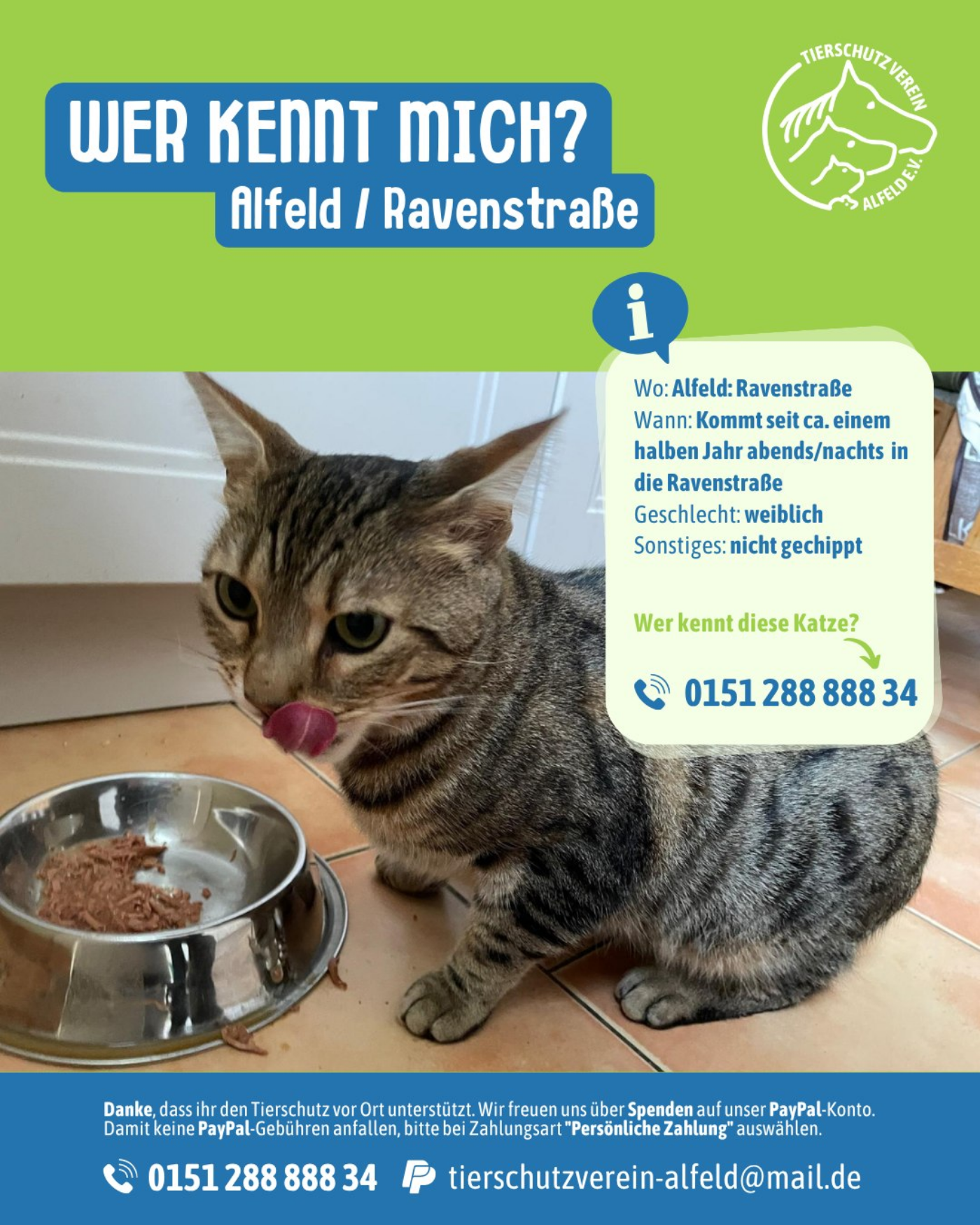 Seit ca. einem halben Jahr taucht sie abends und nachts im Garten der Ravenstraße in Alfeld auf – manchmal kommt sie sogar ins Haus und bleibt über Nacht. Sie ist nicht gechipt.